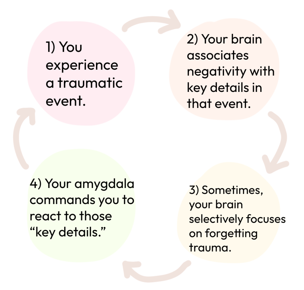 The cycle has four main steps: experiencing a traumatic event, the brain associating negativity with the key details of that event, the brain focusing on forgetting traumatic experiences, and the amygdala reacting when it recognizes those key details later on. Key details could be anything from auditory to olfactory to situational cues—from the smell of a soap to the prickling of watching eyes, the amygdala chooses what to remember and how it thinks it should react when it encounters those details.